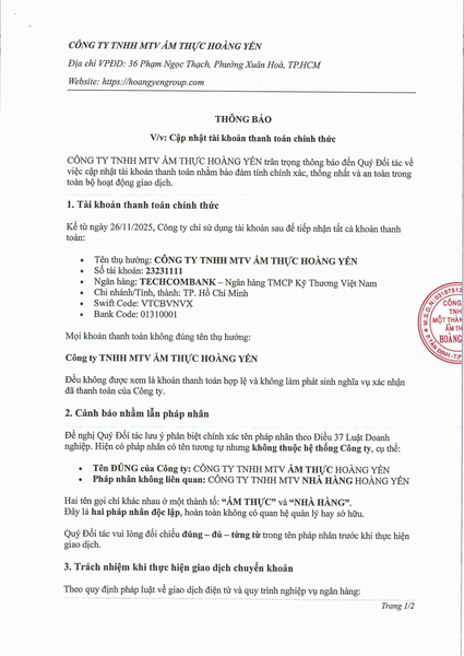 Thông báo: CẬP NHẬT TÀI KHOẢN THANH TOÁN CHÍNH THỨC